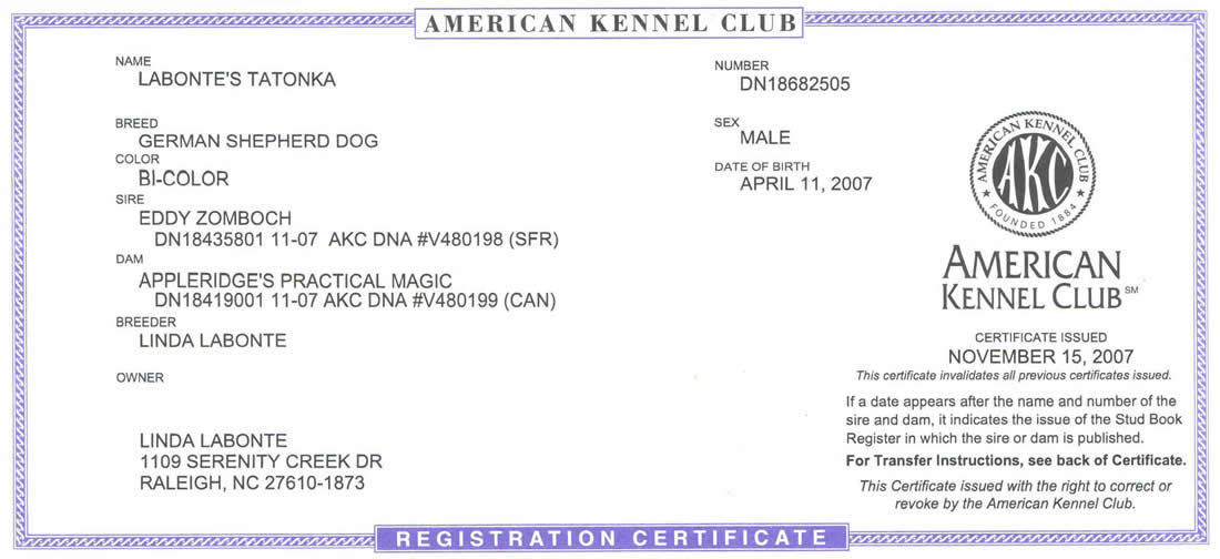 Tonka is a son of Eddy v Zomback (Eddy) and Appleridge's Practical Magic (Xena), granddaughter of top producing stud 6XWUSV 5XFCI Emir Chabet, born April 14, 2007. He is a very strong male with a good temperament. He very tolerant with other animals and likes bite work, tracking and chasing anything that moves.